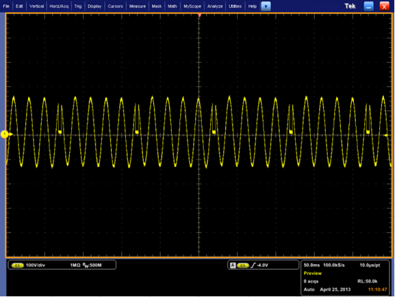 LED灯在工作时所处的电网环境复杂,而且在不断的变化当中,比如打雷闪电,电路开关,电网线路、塔杆等等出现相间、接地短路等情况的时候,在电网中表现出来,就会形成突波或陷波,对用电器造成干扰。所以,LED灯具需要具备一定的抗干扰能力,才能够稳定工作。在测试阶段,艾德克斯的交流电源可以在实验室中模拟各种电网可能存在的扰动,以测试LED驱动电源的可靠性。以下是艾德克斯交流电源输出的突波和陷波干扰波形。