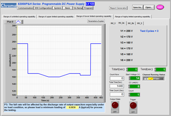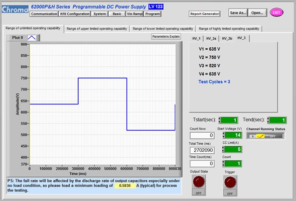 Chroma将LV123其电压范围的操作性能整合于直流电源62000H系列,根据法规条件主动帮用户规划成图形化测试软件,只需一键输出对其待测物执行法规条件测试,有效节省开发时程,便利于汽车电子产品做长时间性能及稳定性测试。