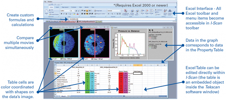 I-Scan内含新的「数据表」功能,可将数据整合进Microsoft Excel表内,并在Tekscan内开启单个Excel电子表格以查看数据,也可以直接在Tekscan软体内进行Excel的自定义计算。