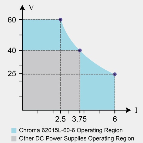 62000L系列直流电源供应器提供宽广的操作范围。例如,62015L-60-6的输出规格为150W/60V/6A可于不同的组合中灵活操作如图蓝色区域所示。于普通的直流电源电源供应器显示仅能操作于单点最大输出功率。