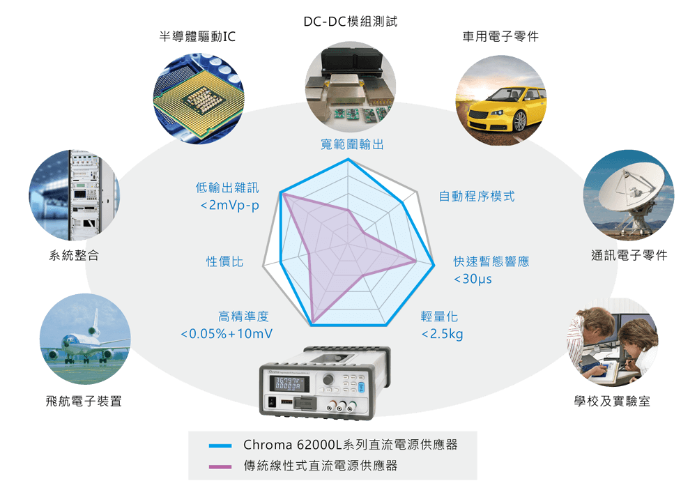 应用于严格电源品质需求的精密产品,如半导体测试及IC驱动电源,因应产品规格与保护待测物,为避免受过大杂讯之干扰,而需求低纹波及低杂讯的纯净品质输入电源。