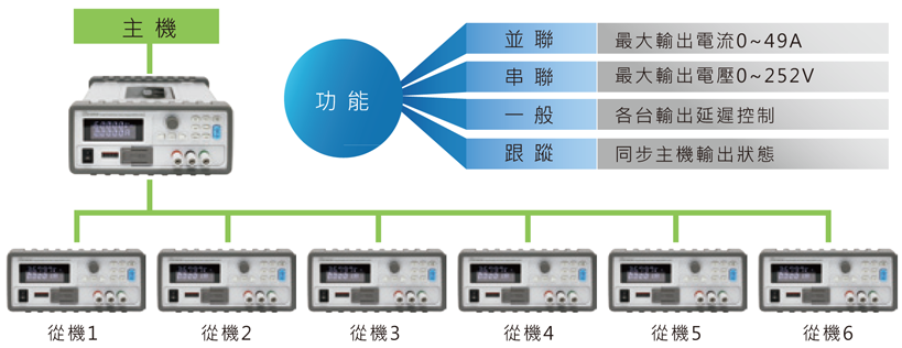 若需要大于额定电压与电流最大输出的应用,可以透过连接多台电源供应器来扩大电压与电流的输出值。最多可同时连接7台,使用串并联的连接来达到更大电压(最大可达252V)与电流(最大可达49A)输出。