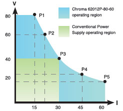 定功率范围下提供宽广操作62000P系列直流电源供应器提供宽广的操作范围。例如,62012P-80-60的输出规格为 1200W/80V/60A可于不同的组合中灵活操作如图右侧所示。如普通的直流电源电源供应器显示提供所有的输出电压相同的额定电流,而62000P于低输出电压时提供较大的电流。这表示低电压/高电流及高电压/低电流两者的待测物可使用单台直流电源供应器测试输入稳定度,于一般的ATE系统内部避免多台直流电源供应器以节省成本与空间。