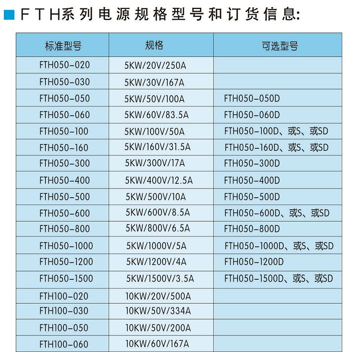 FTH 系列可编程直流电源,包含100个不同的机型,范围从5KW 到15KW,具有电流范围可达750A及电压范围可达1500V。