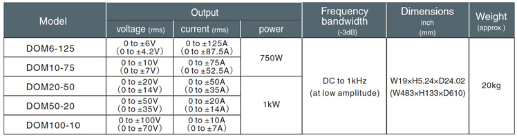 DOM series is a four-quadrant bi-polar power supply which succeeded in miniaturization by high-efficiency switching amplifier method and electric power regenerative function.