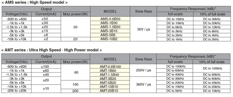 AMS·AMT series is a rack mountable type, fast response high voltage operational amplifier. It gives quick response as fast as 100kHz and provides high voltage outputs in reference to its input wave forms such as Sine, Triangle, Saw Tooth, Square Wave Forms and more. 13 different models are available as an standard unit. They are all solid state. Output voltage ranges from ±600V to ±20kV.