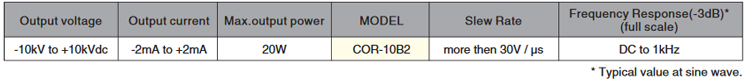 COR-10B2 is a bi-polar high speed HV amplifier developed with our long experience and expertise in HV power supply field. High performance and reliability is achieved by all-solid-state configuration.