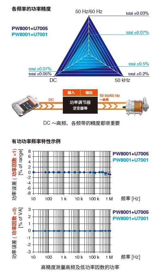 为了评估电源转换效率、需要正确测量从DC 到高频的每个频段的功率。PW8001 不仅可测量50 Hz/60 Hz,还具有 DC 和 50 kHz 等频率带宽的出色测量精度,可用于正确评估功率转换效率。 *使用U7005时
