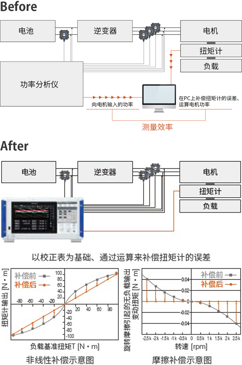 扭矩计的测量误差、会给马达的分析带来很大的影响。PW8001 可用户定义「非直线型补偿」和「摩擦补偿」,并可根据补偿数据进行演算。