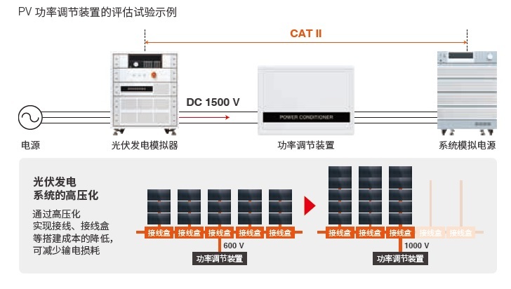 为了减少可再生能源的发电系统的设备搭建成本及输送电能的损耗,需要高压化。对于发电系统的评估需要可对应高电压的测量仪器。 PW8001 的输入单元U7001 可直接输入高压并安全测量高压。可对应DC 1500 V CAT Ⅱ / DC 1000 V CAT Ⅲ *。此外、可同时显示电