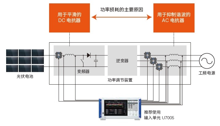 为了改善功率变化的效率、掌握电抗器的功率损耗至关重要。电抗器损耗越低,功率因数会随之下降,正确测量的难度也随之增加。U7005 出色的高频特性及抗干扰特性,非常有助于高频低功率因数的电抗器功率损耗分析。