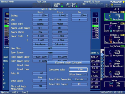 WT1800E不但可以测量电参数, 安装电机评价功能选件后, 还可以通过扭矩转速传感器的模拟和脉冲输出, 测量转速/方向、 扭矩、 机械功率、 同步速度、 滑差、 电角度、 电机效率和总系统效率。