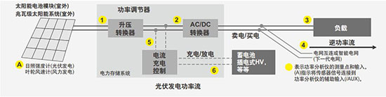 光伏电池模块和风力涡轮机产生的能量通过功率调节器从直流电转换为交流电。 有效度降低这些转换中的损耗, 可以提升整个能源系统的效率。 每台WT1800E能够提供最多6个通道的功率输入, 可以测量每个转换器之前和之后的电压、 电流、 功率和频率(交流), 以及转换器效率和充电效率。
